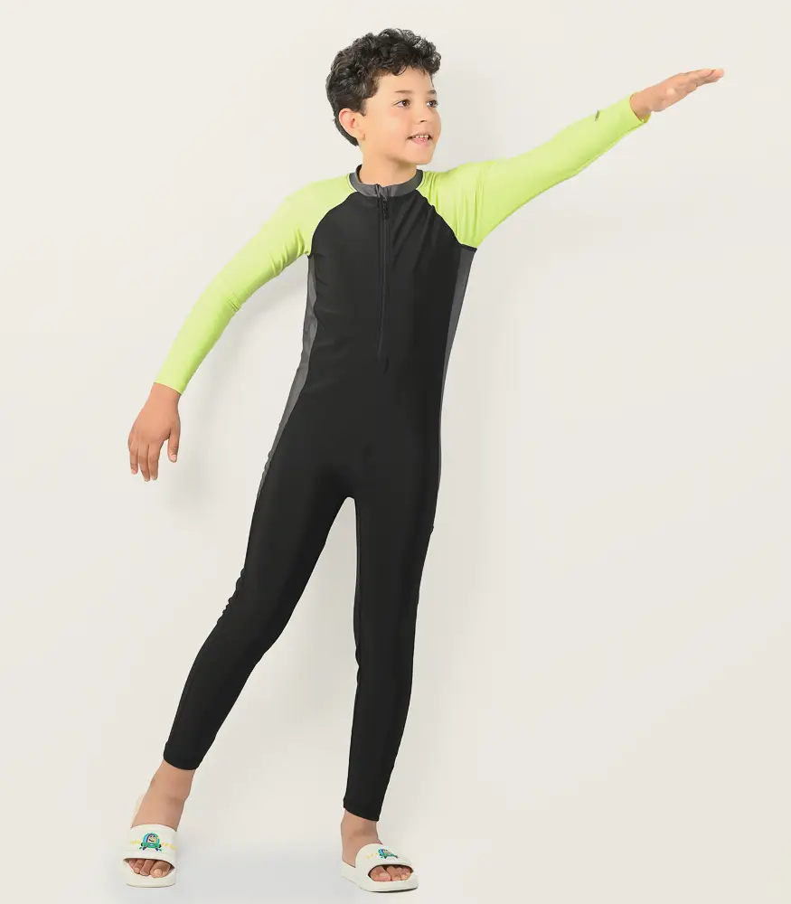 مايوه أولادي سالوبيت بنطلون بتصميم عملي يغطي الجسم بالكامل، خامة مقاومة للماء ومريحة للحركة، حماية مثالية من الشمس أثناء اللعب والسباحة.
